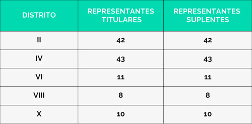En conformidad a la disposición legal precedente y términos del Art. 8° del reglamento de elecciones, la cantidad de representantes Asamblearios Titulares y Suplentes que corresponde a cada Distrito es la siguiente: